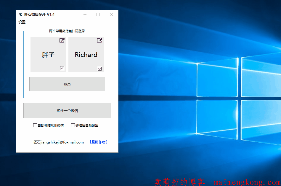 匠石微信多开v1.4功能介绍:1、能保存两个微信账号的登录凭证,一般人都是私人一个号工作一个号2、“多开一个微信”这个按钮可以无限点,点一次启动一个微信,无限多开。3、软件很简单,勾选项可以支持软件启动后自动登录两个常用微信账号。4、设置里可以设置开机启动,取消开机启动。5、支持在线更新检查。PS:启动电脑之后只要在手机上确认登录,两个大号小号微信就已经登录好了,省心。匠石微信多...阅读全文&g... 阅 读 全 部 >