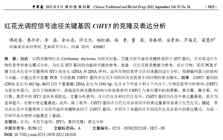 红花光调控信号途径关键基因CtHY5的克隆及表达分析