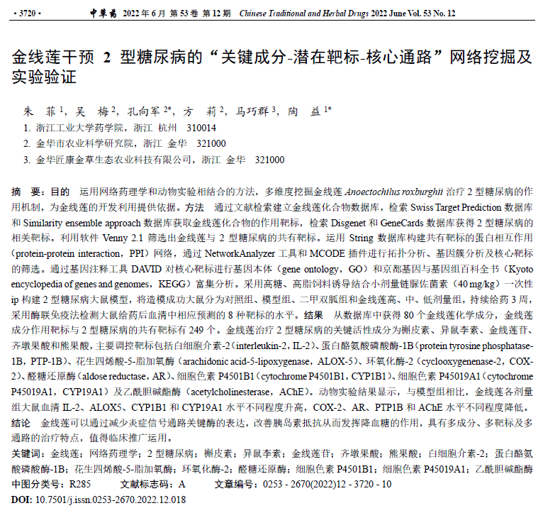 金线莲干预2型糖尿病的“关键成分-潜在靶标-核心通路”网络挖掘及实验验证