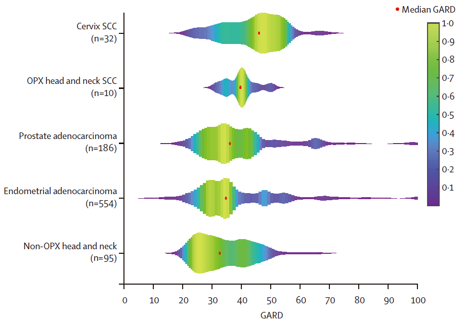 最初小编是在“A genome-based model for adjusting radiotherapy dose (GARD): a retrospective, cohort-based study”这篇文章中看到的一个图。它形似一张提琴图,展示了来自不同类型疾病患者个体的GARD得分的分布,图中红色点代表了中位数。但与常规提琴图不同的地方在于,提琴图中还添加了密度信息,即...阅读全文&...