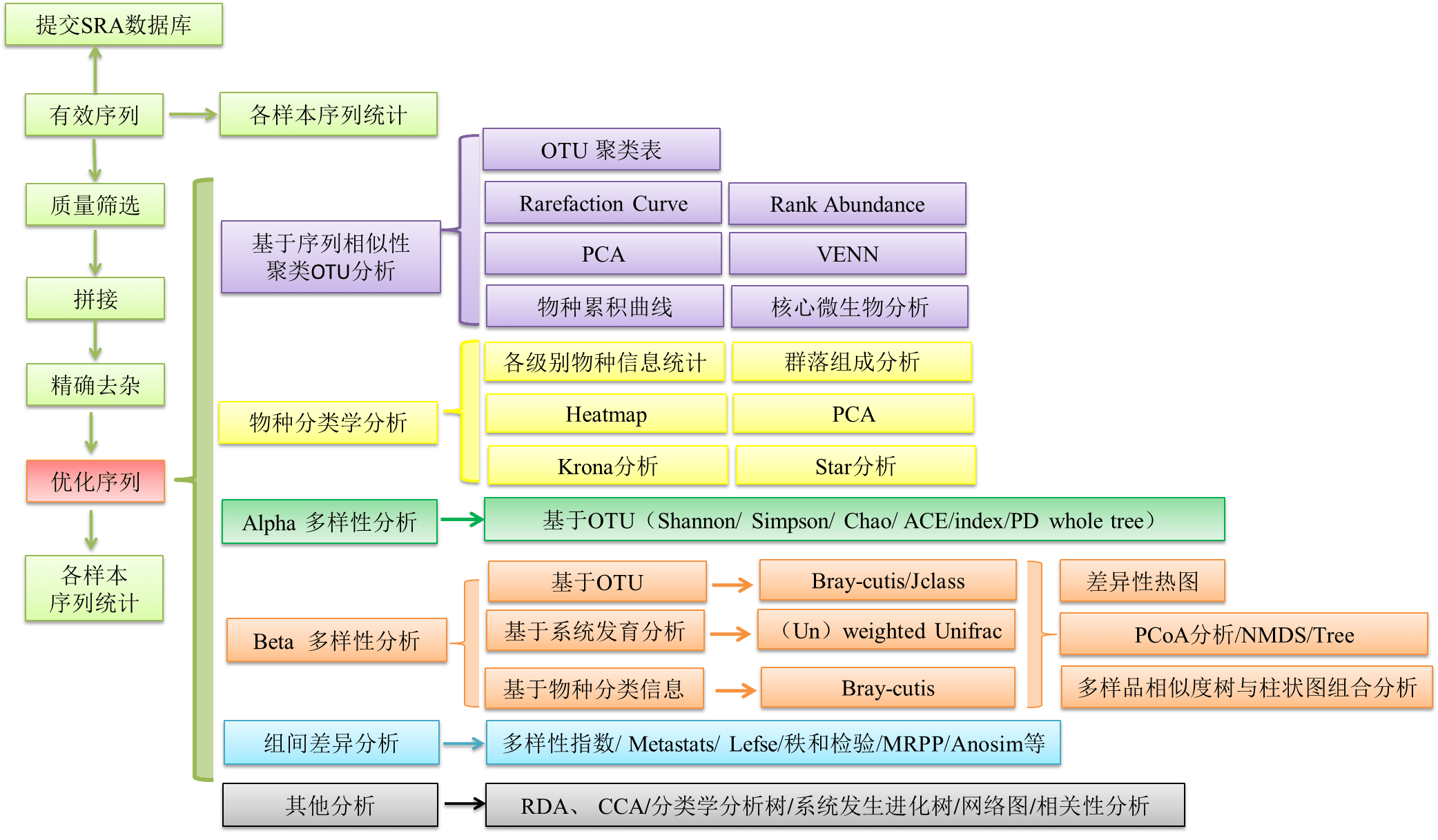 我们拿到测序的数据后,首先根据barcode区分每个样本,然后进行生信分析。这里先抛个砖,简单说说生信分析,下面以细菌为例说明我们的分析结果。生物信息分析流程主要分为6大步:n 序列优化n 优化序列OTU聚类及注释n OTU分析及注释物种分析n 基于alpha多样性分析n 基于beta多样性分析n 差异分析详细流...阅读全文>>...