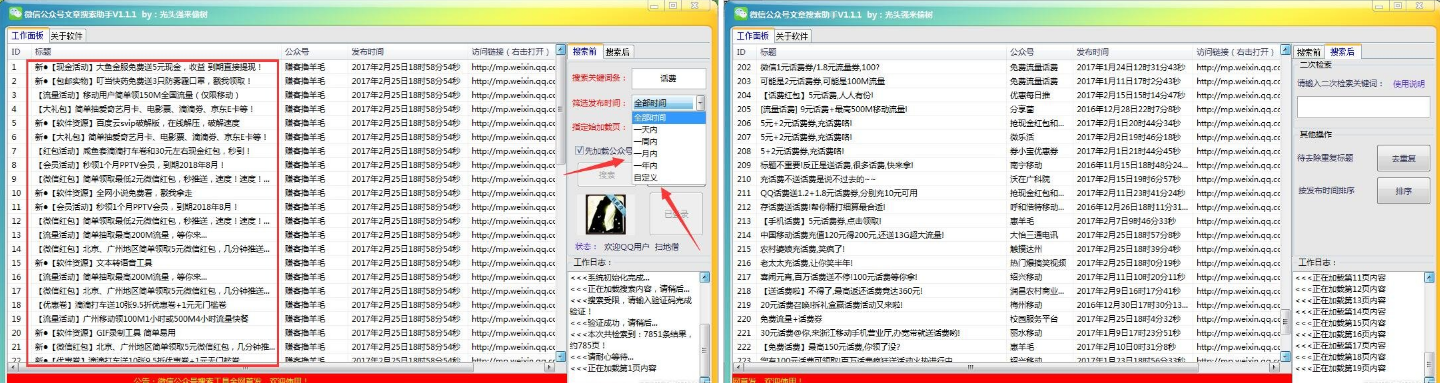 【软件名称】微信公众号文章搜索助手 V1.1.1(2017.2.25)【软件介绍】一款可以搜索腾讯任意微信公众号所推送任意一篇文章的绿色软件,无论你是公众号小编、自媒体人,还是做网赚、搜资料、搜教程、搜任何想搜索的人,它可以帮你搜索任意一个微信公众号所推送的任意内容,可自定义检索发布时间,去除搜索限制,将相关搜索内容通过一个页面全部查找出来,方便查阅,双击标题即可查看文章详细内容。【安全说明】软件... 阅 读 全 部 >