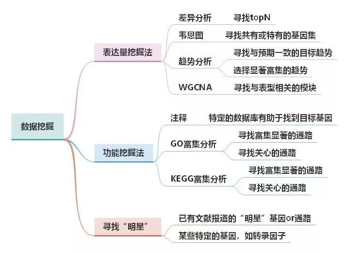 我们上一期介绍了数据挖掘中的表达量挖掘法(回顾戳这里☞),相信大家都已经了解了四大利器的威力,那么今天我们就带大家接着了解一下功能挖掘法和寻找“明星”的数据挖掘方法吧。图1.转录组数据挖掘常用方法功能挖掘法虽然我们进行了表达量的挖掘,但是每个基因在生物过程中都具有它们独特的功能,仅关注表达量的信息,会让我们漏掉非常多的信息。因此我们不能局限于表达量挖掘,而忽略了基因的功能。数据的挖掘除了...阅读... 阅 读 全 部 >