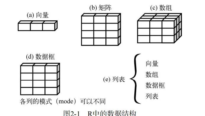 预计阅读时间4分钟R拥有许多用于存储数据的对象类型,包括标量、向量、矩阵、数组、数据框和列表。它们在存储数据的类型、创建方式、结构复杂度,以及用于定位和访问其中个别元素的标记等方面均有所不同。下图是一张R语言数据结构图。文章目录快速检索,先看看哪部分感兴趣,查漏补缺~向量向量类型向量的创建向量中元素的访...阅读全文>>...