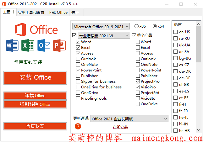 Office 2013-2019 C2R Install v7.3.5是由俄罗斯人Ratiborus制作的Microsoft Office下载、安装、管理的自定义部署工具。它可以在线下载安装 Office 2013-2019 的各个版本,离线安装部署Office镜像,自定义安装Office产品组件,支持Office零售版转换批量许可版,在线KMS激活Office,可选内置Office...阅读全文...