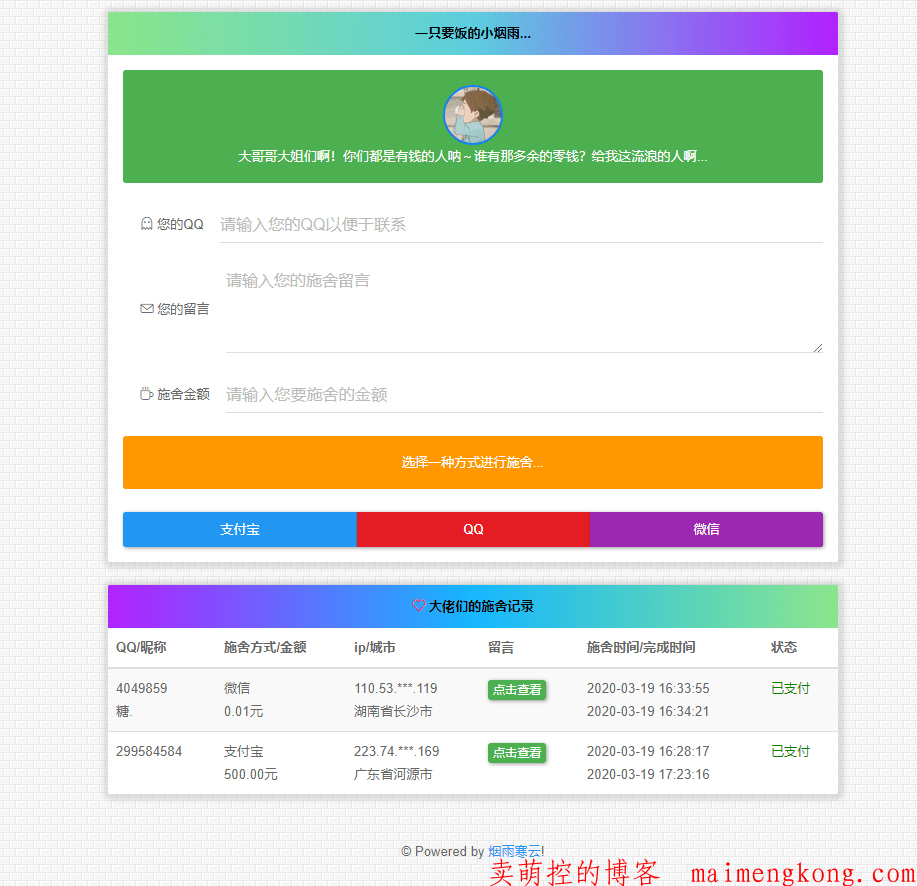时隔一年多,烟雨云要饭系统再次来袭,此次更新底层全部重构,拖拖拉拉终于写完! 本次亮点: 1.全自动引导安装,无法安装的几率小之又小,小白也能轻松装 2.整体架构性能提升 3.全Ajax操作,更人性化 4.强制使用php7,性能更上一层楼 5.没得哔哔了。。。 更新日志: 2020/3/20 1.修复后台无法... 阅 读 全 部 >