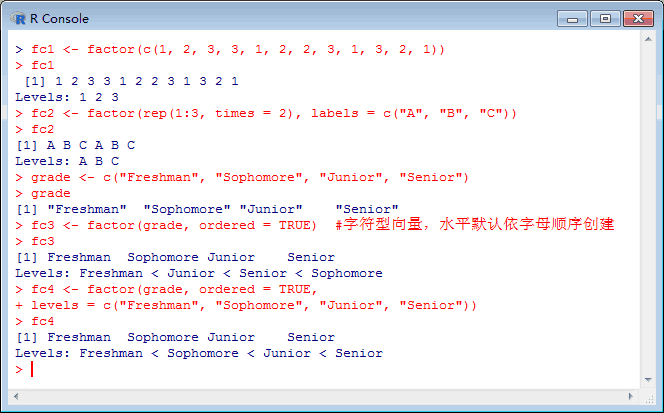 因子在R语言中可以用来表示名义型变量或有序变量。名义变量一般表示类别,如性别,种族等等。有序变量是有一定排序顺序的变量,如职称,年级等等。在R语言中,名义变量和有序变量可以使用因子来表示。创建因子在R语言中可以使用factor()函数和gl()函数来创建因子变量。(1)使用factor()函数factor()函数的语法格式为:f <- facto...阅读全文>>... 阅 读 全 部 >