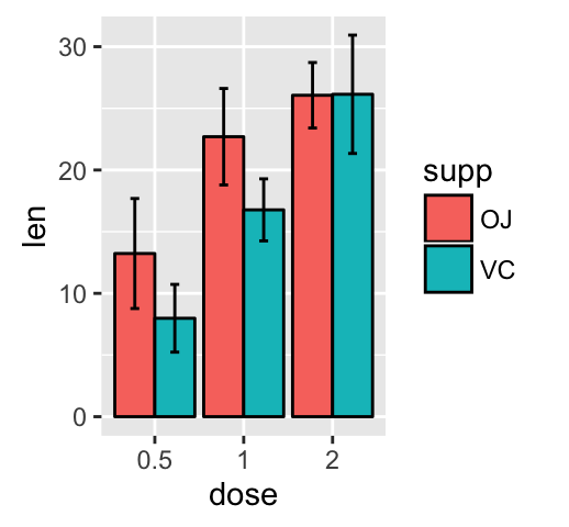 给直方图和线图添加误差棒 准备数据这里使用ToothGrowth 数据集。它描述了维他命C对Guinea猪牙齿的生长影响。包含了三种不同的剂量(Vitamin C (0.5, 1, and 2 mg))和相应的两种不同使用方法( [orange juice (OJ) or ascorbic acid (VC)])。library(ggplot2) df <...阅读全文>>... 阅 读 全 部 >