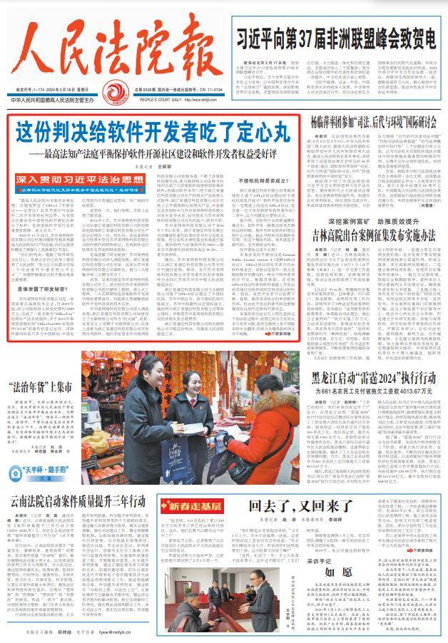 这份判决给软件开发者吃了定心丸 ——最高法知产法庭平衡保护软件开源社区建设和软件开发者权益受好评“最高人民法院对本案的妥善处理,合理地界定了GPLv2(开源协议——记者注)此类开源许可证软件二次开发者的权利边界,为我国正在建设有中国特色的开源社区树立了标杆,是我国软件开发行业的重要里程碑,意义非凡。”2023年11月22日,苏州某网络科技有限公司总经理刘继明专程来到最高人民法院知识产权法庭,向合议...