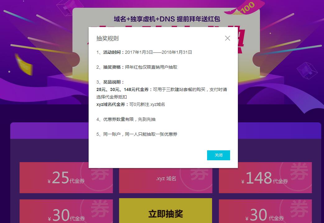 1月3日补充最新一期,亲测几率贼高,已中活动时间:2018.1.3~1.31活动地址:https://promotion.aliyun.com/ntms/act/jianzhandiscount2017.html阅读全文>>...