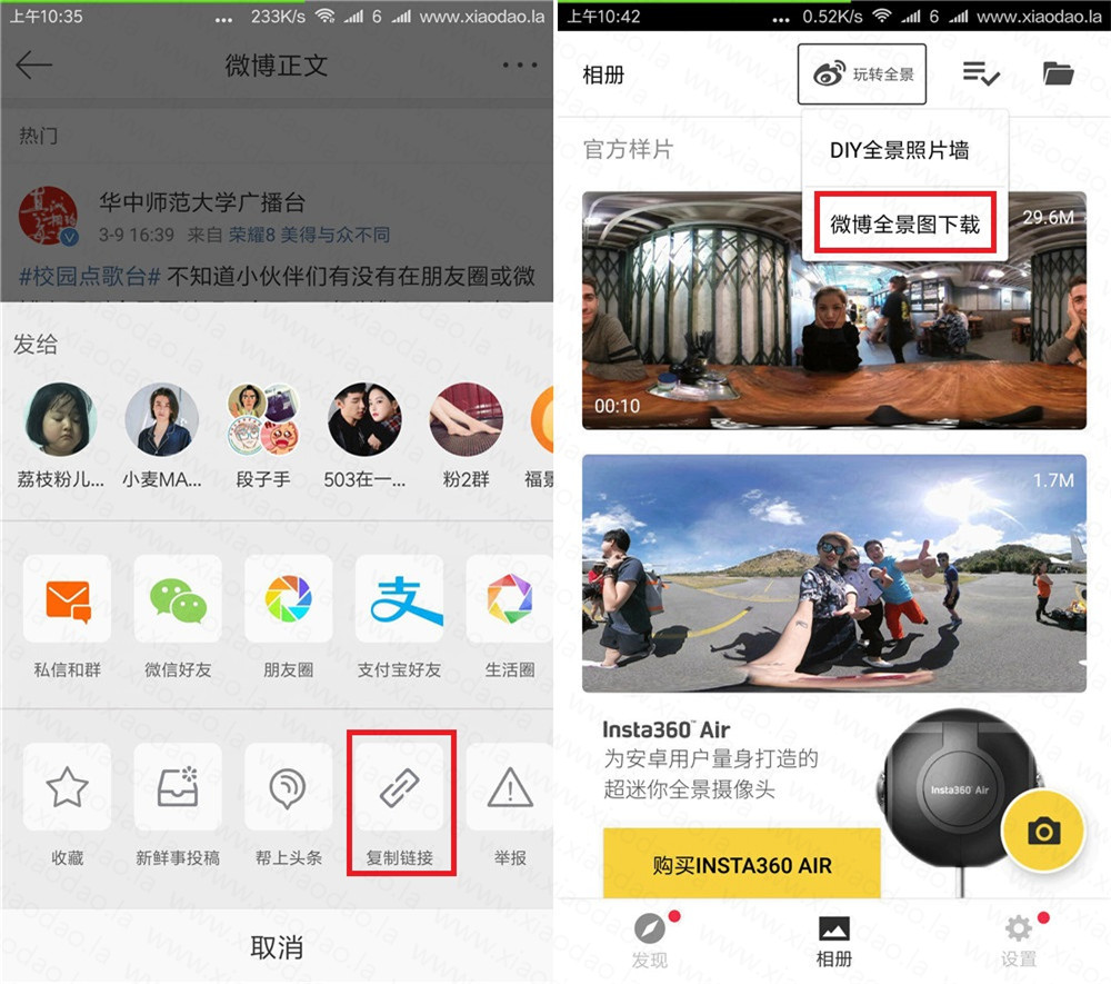 步骤如下:1、打开微博APP->搜索“全景图”找到你喜欢的进入->右上角4个点复制链接2、打开:http://t.cn/REBIcfo 下载Insta360Air APP 粘贴微博链接下载3、打开QQ空间,发说说的时候选择带全景标识的图片->发布后即可看到效果阅读全文>>... 阅 读 全 部 >