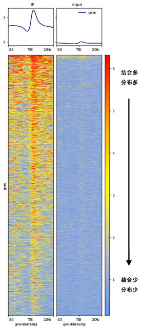 eak在TSS上下游的分布图是ChIP测序中非常关键的一张图。有这张图,我们就能知道目的蛋白(组蛋白或转录因子)在转录起始位点(TSS)及上下游附近的整体分布/结合情况。 图中横坐标为基因位置,纵坐标为reads的覆盖深度,它可以反映目的蛋白分布情况。input由于没有富集,其reads通常分布较低,而IP对目的蛋白及其结合序列的富集作用则会使reads覆盖深度提高,产生相应的...阅读...
