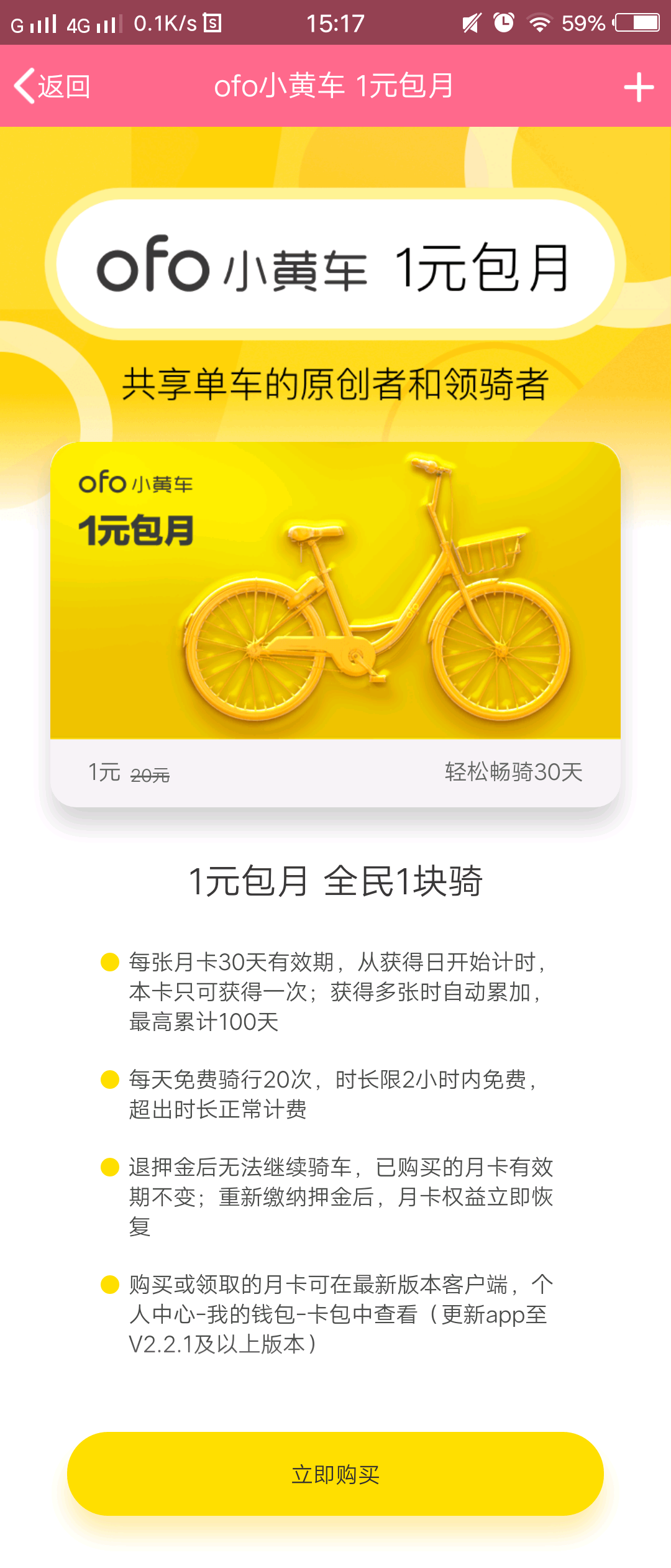 ofo小黄车“1元月卡”还能免费抢 而且是3张