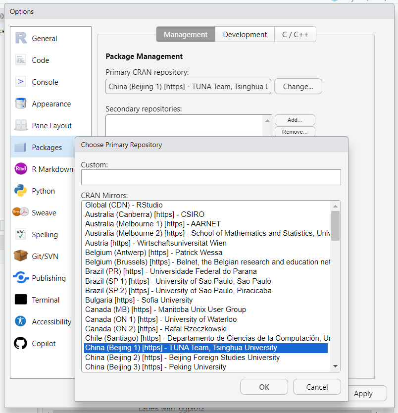 CRAN安装R包CRAN (Comprehensive R Archive Network) 是 R 语言的官方仓库,几乎所有主流的 R 包都可以通过 CRAN 安装。镜像设置建议使用CRAN安装R包前,将镜像设置为离您较近的镜像点,这里推荐清华大学提供的CRAN镜像,选择后,保存即可。CRAN镜像设置安装时可以点击Packages标签内的Instal...阅读全文>>...