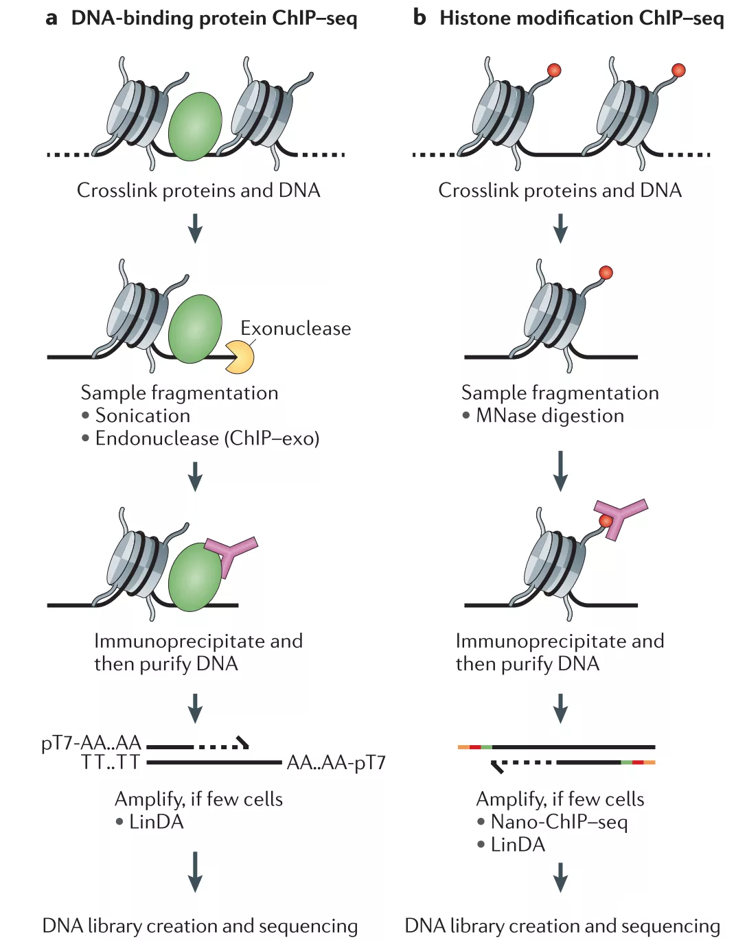 1. CHIP-seqChIP-Seq技术是研究蛋白质与DNA相互作用的有力工具,利用该技术可以检测转录因子与DNA的动态调控作用,各种组蛋白修饰,染色质调控因子等,转录因子与组蛋白修饰的ChIP-Seq示意图如下:ChIP-Seq技术包括两部分:建库和测序,建库和测序的质量对于后续分析尤为关键,但是建库前ChIP实验的设计也同样重要。从实验的操作来讲ChIP主要分为两大类,一类是X...阅读全文...