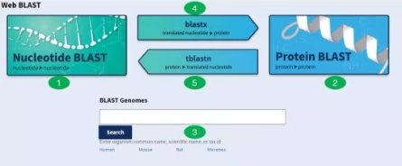 毋庸置疑,NCBI,UCSC,Ensembl,UniProt四个数据库功能非常强大,下面给大家介绍下我自己用的最多的功能。NCBI 中BLAST工具NCBI中的Nucleotide BLAST、Protein BLAST、BLAST Genomes(对应图中的1、2、3),这三种比对工具用的最多,其余两种blastx、tblastn(对应图中的4和5),用的相对较少,但是不得不说,...阅读全文&... 阅 读 全 部 >