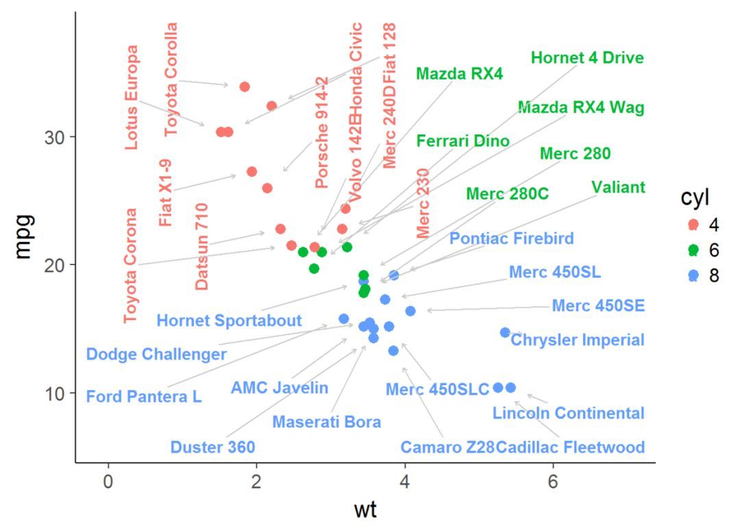 taoyan:伪码农,R语言爱好者,爱开源。个人博客: https://ytlogos.github.io/library(ggplot2)#使用数据集mtcars演示ggplot(mtcars)+ geom_point(aes(wt, mpg), color="red")+geom_text(aes(wt, mpg, label=rownames(mtcars)))+theme_cl...阅读全... 阅 读 全 部 >