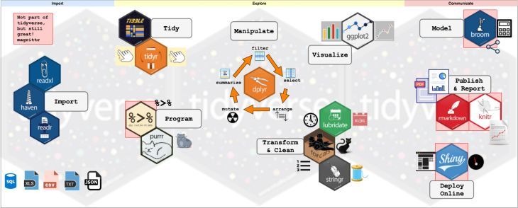 1 什么是整洁数据?2 tidyverse怎么使用?tidyverse是由RStudio首席科学家Hadley Wickham开发的R套装的集合。 这些包作为大数据分析管道的一部分可以很好地协同工作。要了解这些工具及其协同工作的更多信息,请阅读R for data science。 对于R的新手,请查看我之前的Storybench教程:RStudio笔记本中的R入门。以下教程将介绍...阅读全文&...